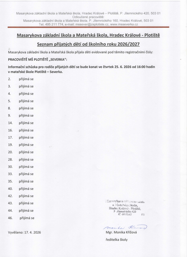 SEZNAM PŘIJATÝCH REGISTRAČNÍCH ČÍSEL